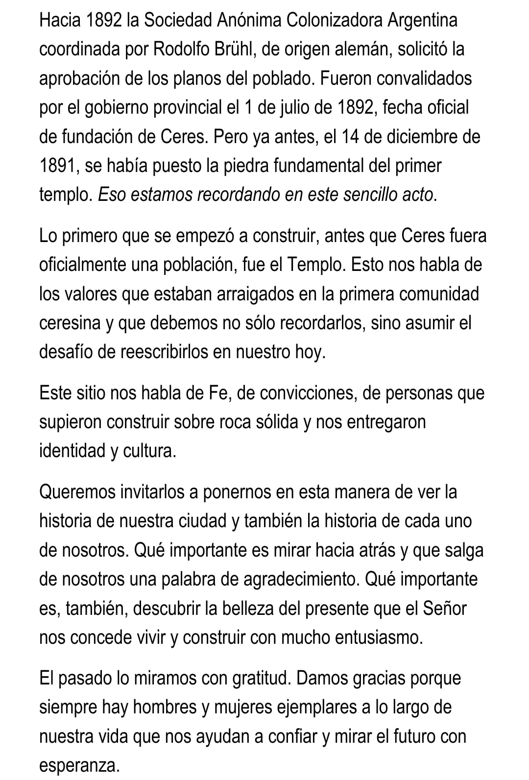 «Comenzamos con la animación musical a cargo de Alfredo Espíndola, escuchamos un interesante relato sobre la edificación del Templo por parte de Edelweis Varaldo, y finalizamos con unas palabras emotivas y llenas de esperanza, escritas por Madre Graciela y el padre José María, y leídas por Claudia Perelló