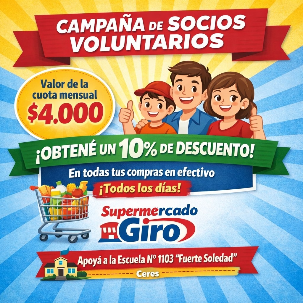Gustavo Bonisconti, director de la Escuela N° 1103 Fuerte Soledad contó sobre la iniciativa en FM 98.7 Mhz. que junto la Familia Mendoza de Supermercado Giro impulsan una campaña de socios voluntarios. con una cuota mensual de 4 mil pesos a beneficio de la Escuela, tenes descuento de 10% todos los días con tus compras en efectivo.