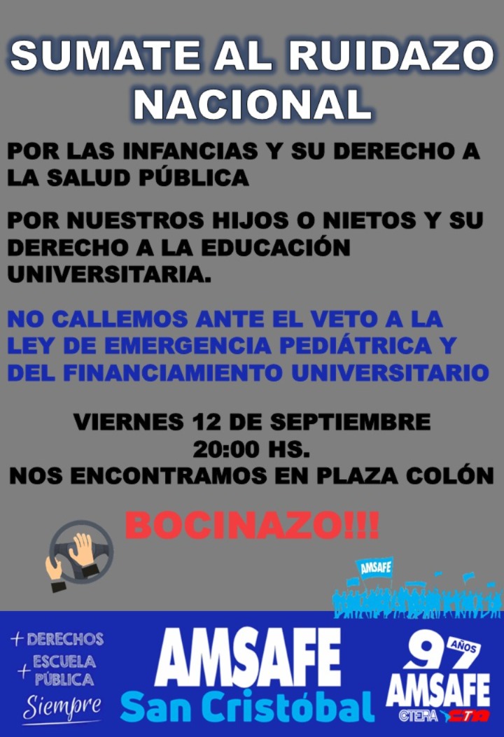 AMSAFE: «En Ceres nos sumamos al Ruidazo Nacional en contra de los veto del presidente y defensa de la universidad pública y del derecho a la salud de nuestros niños y niñas»
