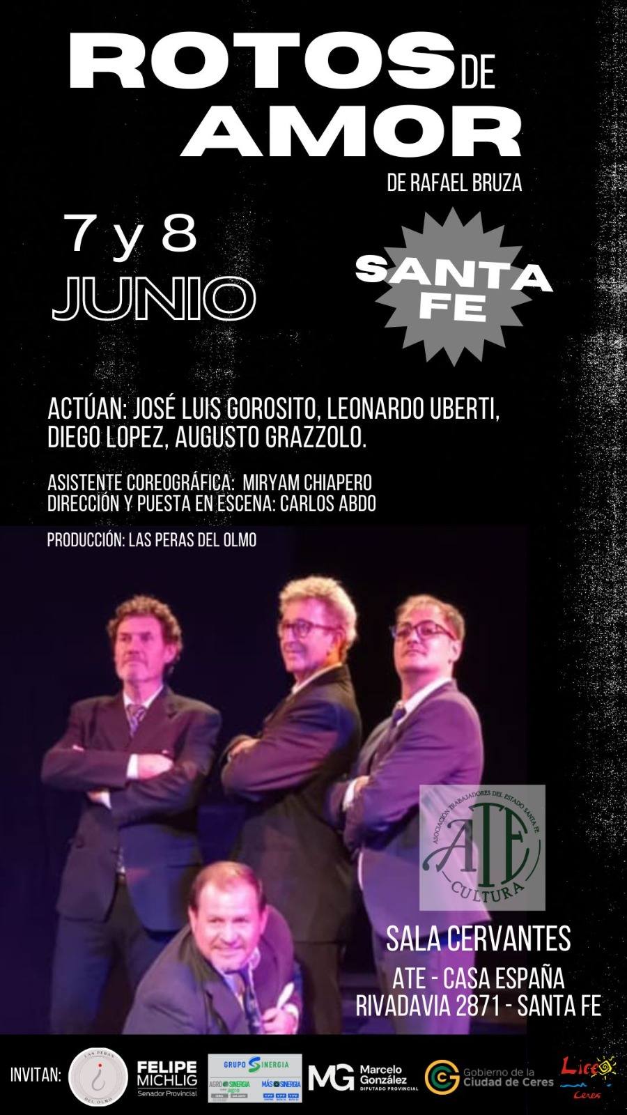 «Rotos de Amor» de Rafael Bruza continua con los éxitos, en junio realizará dos presentaciones en Santa Fe capital. además participará de un festival teatral local, un festival internacional de teatro y brindará su espectáculo en localidades del departamento.