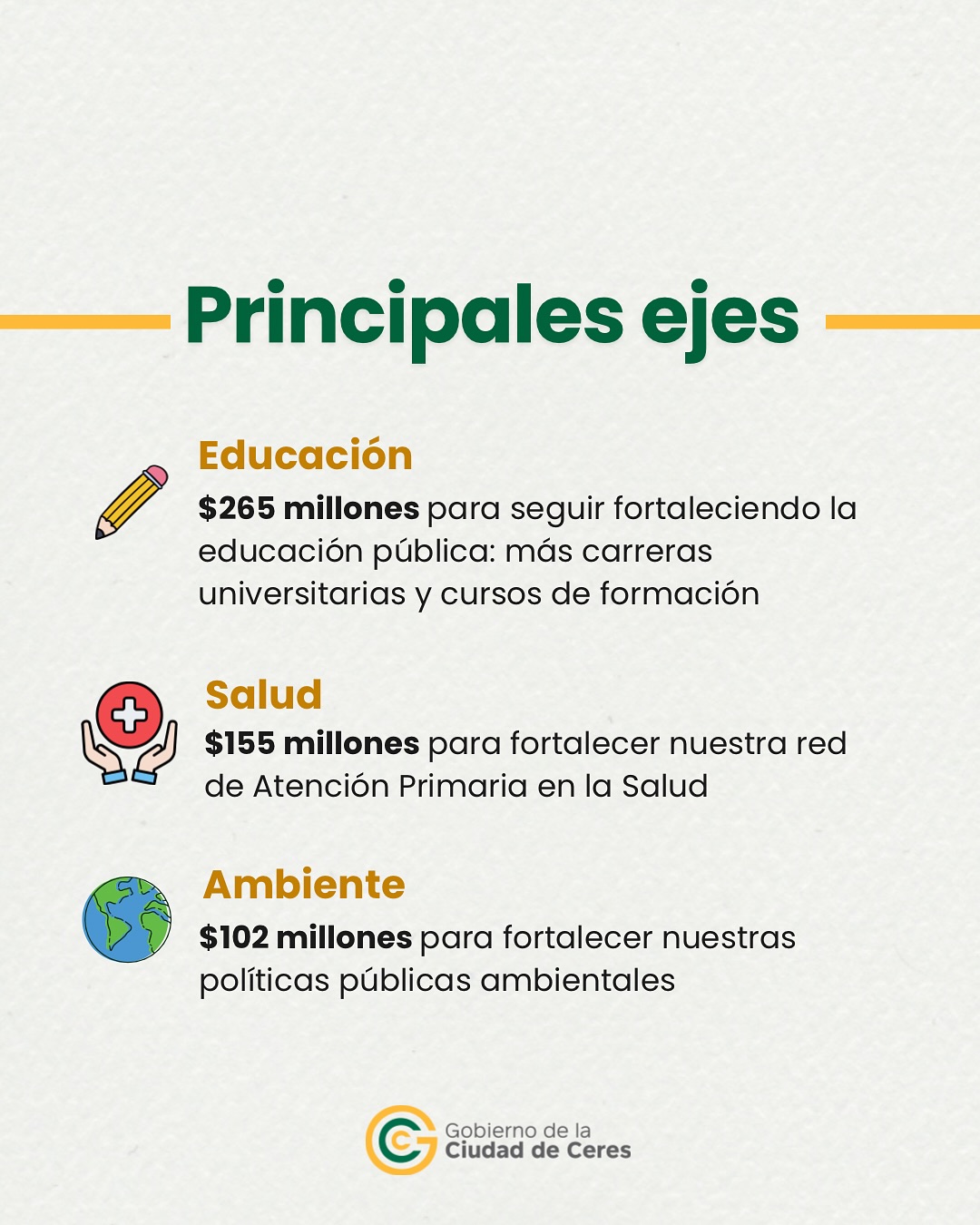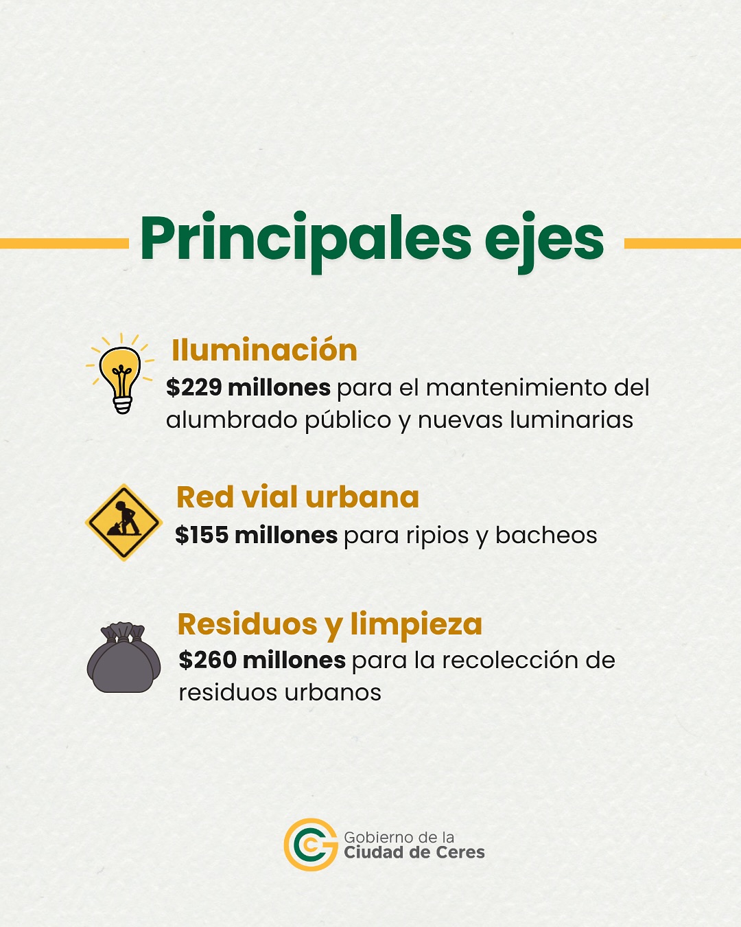 También te contamos cuáles son los ejes principales y cuánto se destinará a cada uno iluminación, red vial urbana, residuos y limpieza, educación, salud y ambiente