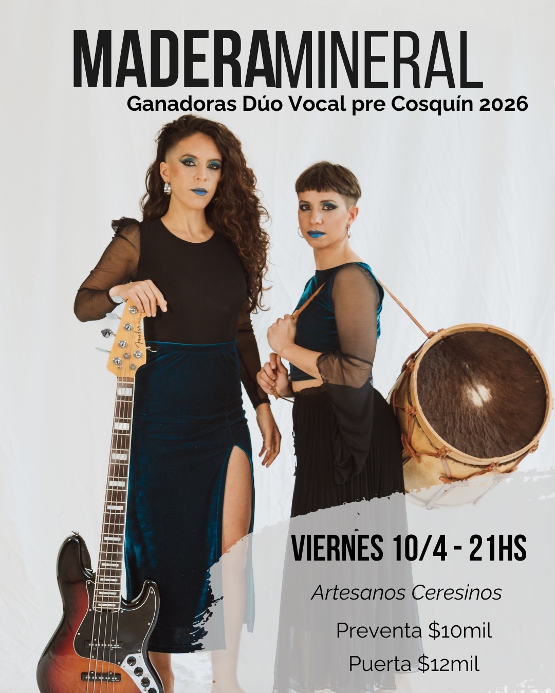 Grisel y Cami llegan a Ceres con MaderaMineral, el dúo vocal femenino ganador del Pre Cosquín que brilló en la 4ta luna del Festival Nacional de Folclore 2026. Esta noche en la Casita de Artesanos, se presenten para presentar toda su música. Organizado por Artesanos Ceresinos con entradas en venta, servicio de buffet y la calidez de los organizadores, Ceres vivirá una gran noche de viernes!!!