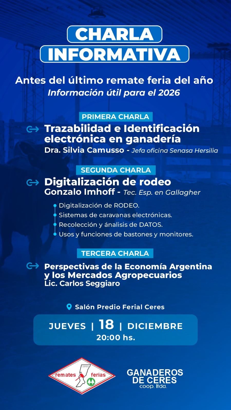 Productores Ganaderos se reunieron en las instalaciones ferias de Ganaderos de Ceres donde se realizaron varias charlas sobre el nuevo sistema electrónico de caravanas, a cargo de Gonzalo Imhoff de Gallagher, Silvia Camusso del Senasa y el cierre con el analista económico Carlos Seggiaro. Además la oportunidad sirvió para sellar una acuerdo de trabajo entre ambas cooperativas, Ganaderos de Ceres y Coop. Santa Rosa.