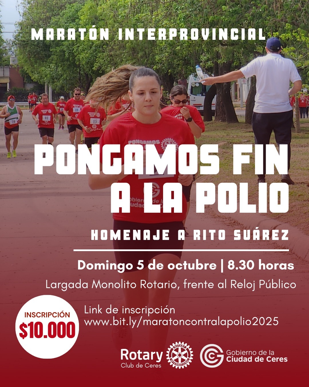 El próximo domingo 5 de octubre el Rotary Club de Ceres realiza la 4° MARATÓN «PONGAMOS FIN A LA POLIO» con un homenaje a Rito Suarez.
