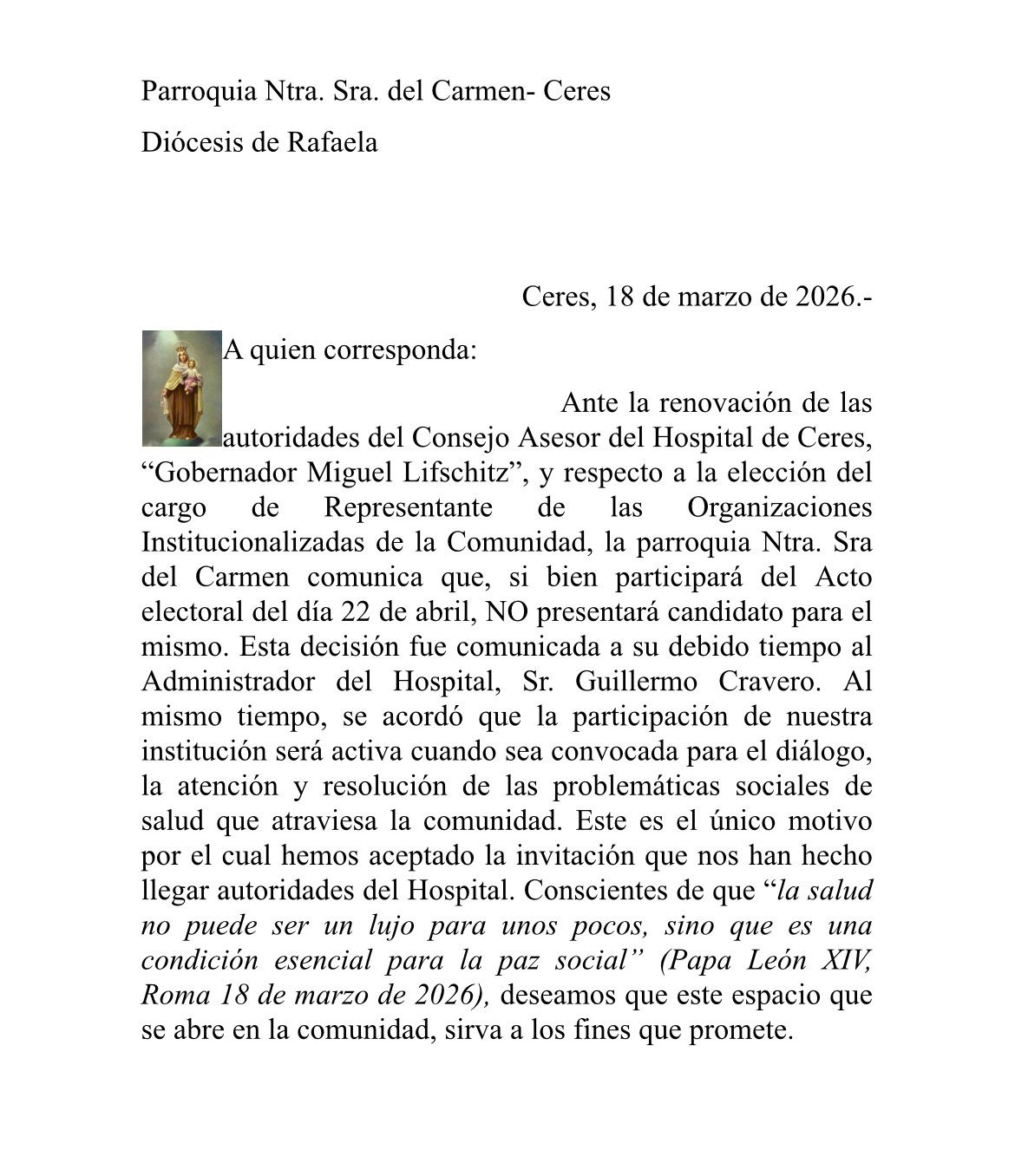 Ante la renovación de las autoridades del Consejo Asesor del Hospital de Ceres, “Gobernador Miguel Lifschitz”, y respecto a la elección del cargo de Representante de las Organizaciones Institucionalizadas de la Comunidad, la Parroquia Ntra. Sra del Carmen comunica que, si bien participará del Acto electoral del día 22 de abril, NO presentará candidato para el mismo.