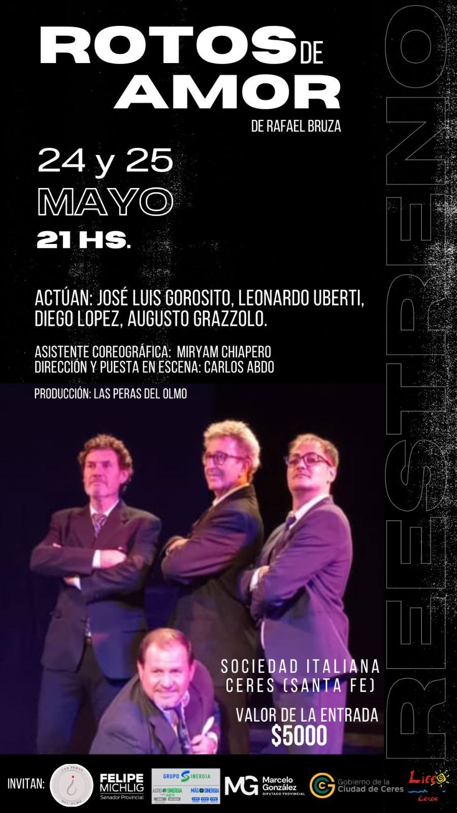 «Rotos de Amor» de Rafael Bruza se estrena este sábado 24 y tendrá dos presentaciones en Ceres. en tanto en junio, realizará dos presentaciones en Santa Fe capital. además participará de un festival teatral local, un festival internacional de teatro.